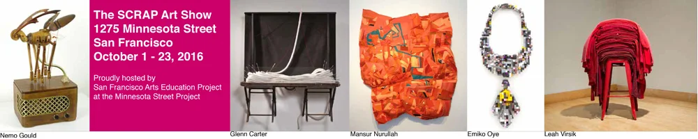 In honor of its fortieth year, SCRAP is excited to present Reclaimed: Elevating the Art of Reuse, a juried art exhibition that will run from October 1 through October 23 and proudly hosted by the San Francisco Arts Education Project (SFArtsED) gallery, located in the Minnesota Street Project. Gallery hours are 11:00-5:00 Tuesday-Saturday